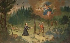 Ein "grausam pestilenzischer Sumpf" soll der Gründungslegende nach über der Stätte gelegen haben: "Sogar die Vögel im Lufft waren nit geschwind genug / mit jhrem Flug zu endtfliegen / der Dampf thäte sie obereylen / hinunder zihen / vnd erstecken, dahero von den Leuten dieser klägliche Namen Todt-Moss geschöpffet". Da sei die Gottesmutter 1255 dem Leutpriester Dietrich von Rickenbach (dessen Existenz verbürgt ist) erschienen: "So dir dein Heyl vom Herzen angelegen / ond mich für deine Patronin erkennst / so mache dich uff / nach dem Ohrt Schönenbühel / welcher zwischen zweyen fließenden Bächen / deren einer Wehrach / der ander Todenbach genannt / gelegen uff dem Schwarzwald." Er solle die mit einem Kreuz bezeichnete Tanne fällen und dort eine Kapelle bauen, so werde der Ort eine Stätte der Gnade werden.Diese Gründungslegende ist in der rechten Seitenkapelle der Kirche eindrücklich bildhaft dargestellt sowie in großer Ausführlichkeit in alten Pilgerbüchern beschrieben. Auch heute noch gilt die Stelle unter der obersten Altarstufe in dieser Kapelle, die durch ein Gitter mit dem darunter liegenden Raum der früheren Kirche verbunden ist, als Standort der Tanne aus der Legende und als ein Platz besonderer Kraft und Wirkung. Diesen Ort aufzusuchen, ist für viele Wallfahrer und Gäste nach wie vor wichtiger Bestandteil eines Besuches unserer Kirche.